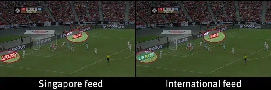 Catalyst Media acquires, creates, and develops international and Asian sports properties. For their local Singapore feed, Catalyst Media used a “SINGAPORE” advert, while simultaneously using a “LOVEBET” advert for the international feed. Using Viz Arena to insert these ads allowed Catalyst Media to place the ads on the pitch virtually, without the need of additional hardware in the stadium. The matches were broadcast live in 179 countries.